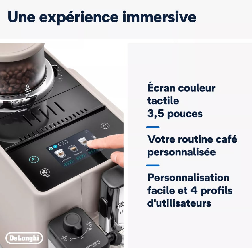 La Rivelia Latte de Delonghi offre une expérience café immersive avec 2 bacs à grains interchangeables, écran tactile 3,5″, 16 boissons personnalisables et une mousse de lait idéale. Design compact et technologie intuitive pour un café haut de gamme à la maison.